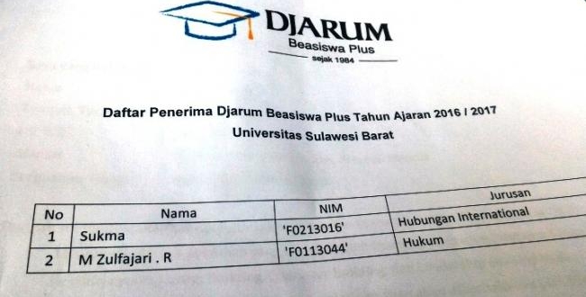 Data yang dihimpun KARAKTER, Dua mahasiswa Unsulbar yang dinyatakan lolos menerima beasiswa plus dari Djarum itu masing – masing : Sukma dan M. Zulfajri R. keduanya berasal dari Fakultas Ilmu Sosial Ilmu Politik ( FISIP ).