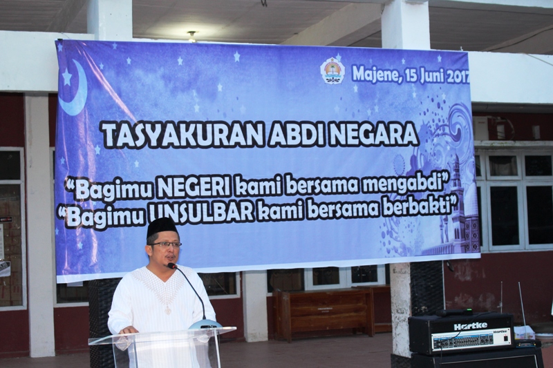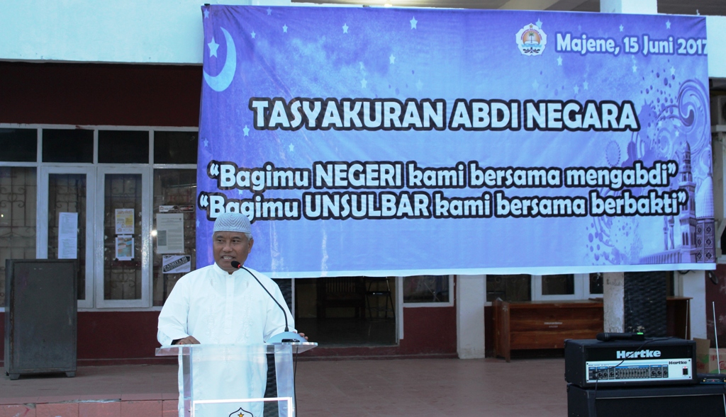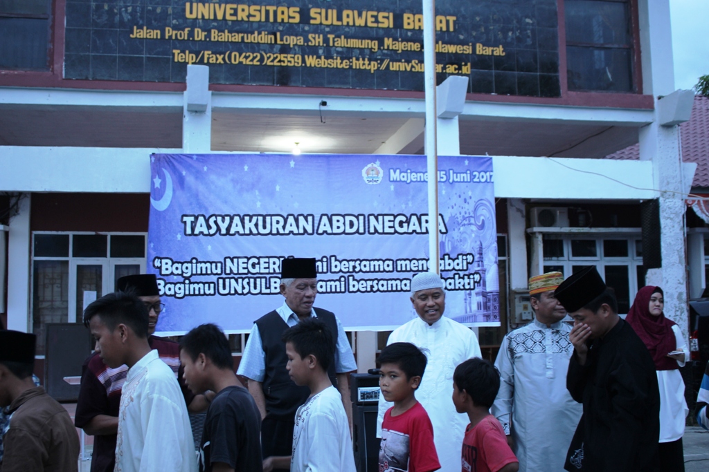 Tasyakuran Abdi Negara yang berlangsung di halaman rektorat Unsulbar tersebut dihadiri antara lain : Rektor Akhsan Djalaluddin, Dewan Pembina Dr. Rahmat Hasanuddin, dekan Fakultas Ekonomi Mujirin M. Yamin, Dekan Pertanian dan Kehutanan Prof Mir Alam, Ketua LPPM Dr. Kadir Paloloang dan kepala biro Administrasi Akademik dan Kemahasiswaan, Latif Dollah.