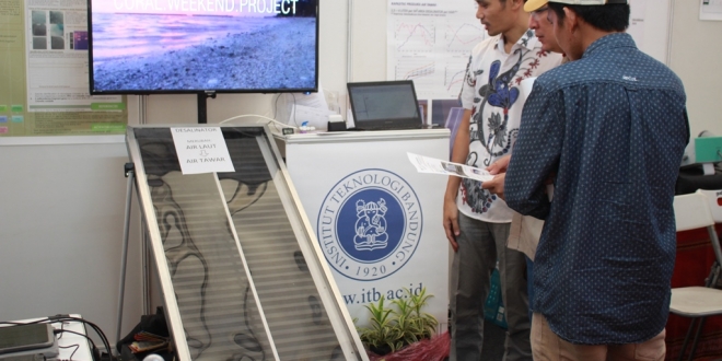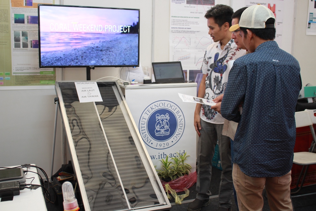 Kepada KARAKTER, Andri, mahasiswa ITB yang berada di stand pameran menjelaskan, air laut diubah menjadi air tawar dan siap untuk diminum dengan proses Energi dari matahari akan membuat air laut mengalami proses penguapan.