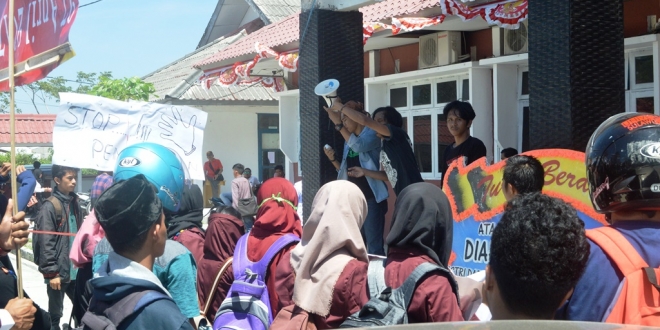 Dalam selebaran yang dibagikan para mahasiwa pengunjuk rasa serta orasi secara bergantian di depan rektorat, lima poin tuntutan mahasiswa itu adalah :