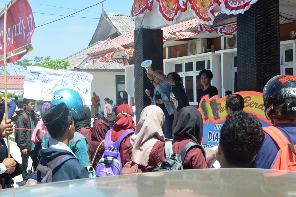 Setelah secara bergantian melakukan orasi, mahasiswa kemudian berdialog dengan Wakil Rektor I bidang Akademik dan Kemahasiswaan, Dr. Muhammad Saad.