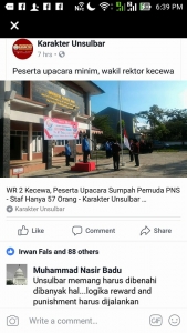 Pernyataan Dr. Muhammad Nasir Badu itu disampaikannya melalui akun facebooknya, Senin (30/10). Ia mengomentari berita di akun facebook Karakter Unsulbar tentang kekecewaan wakil rektor 2 Unsulbar, Anwar Sulili terkait minimnya kehadiran PNS dan staf di upacara Hari Sumpah Pemuda.