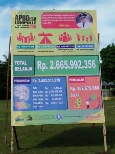 Foto : Baligo Anggaran Desa Pambusuang dipajang di jalan utama desa, depan masjid setempat. Pendapatan dan pengeluaran pemerintah desa dapat dilihat setiap saat oleh warga. ( Foto : Misbah Sabaruddin )