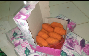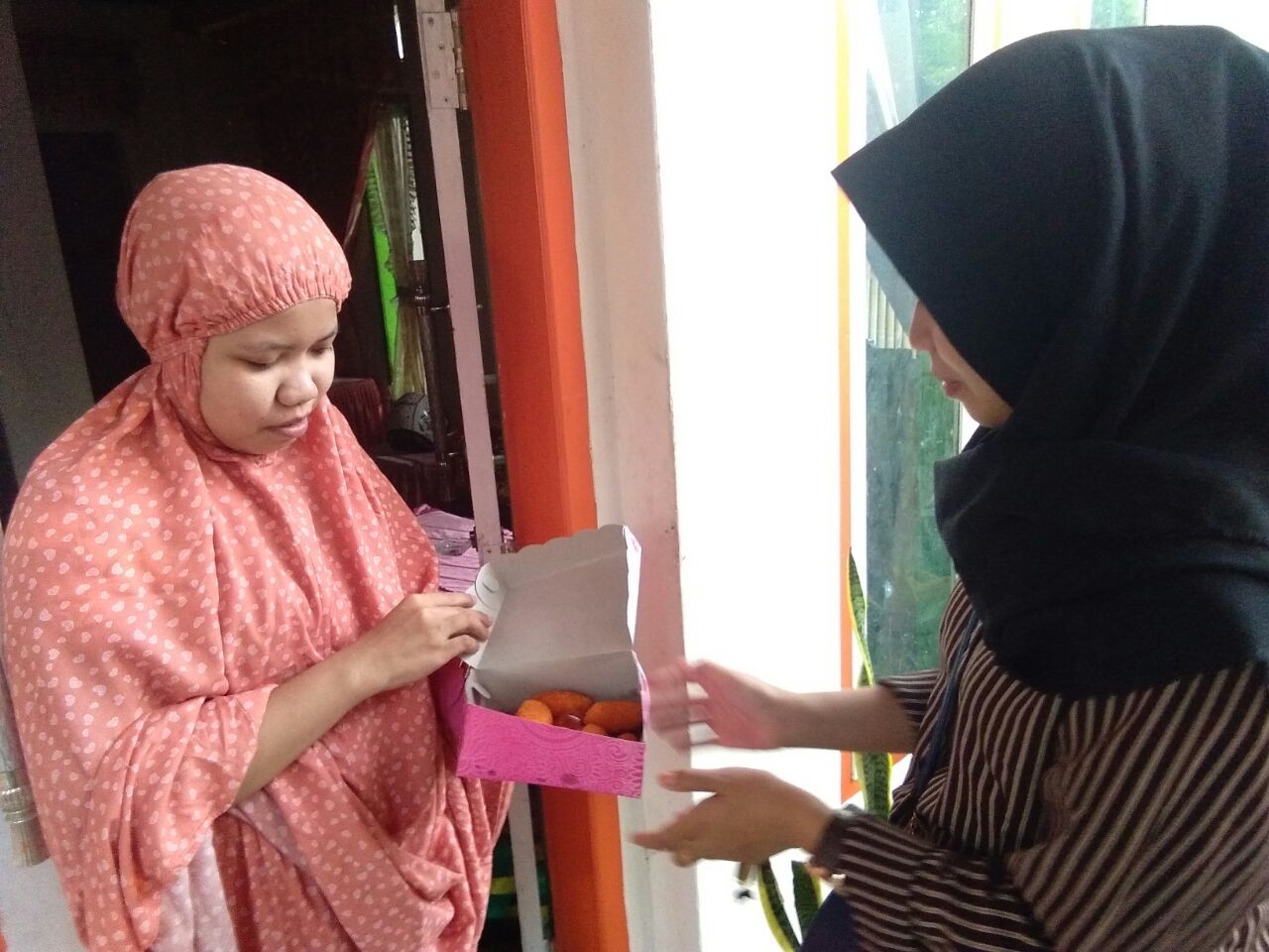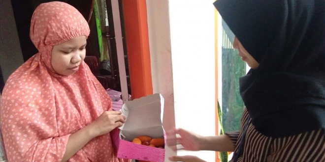 Foto salah satu pelanggan (Kerudung Orange) menerima pesanan Tahu Nuget. (Foto ist)