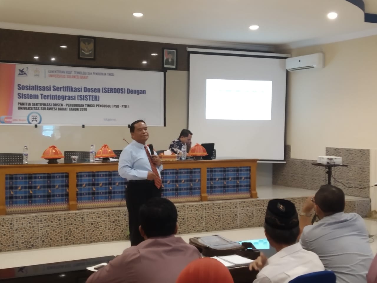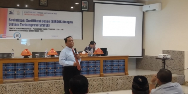 Panitia Sertifikasi Dosen – Perguruan Tinggi Pengusul (PSD-PTU) Universitas Sulawesi Barat (Unsulbar) gelar sosialisasi Sertifikasi Dosen (Serdos) SISTER di Aula Sandeq Room, Hotel Villa Bogor Leppe, Majene, Senin (25/03/19).
