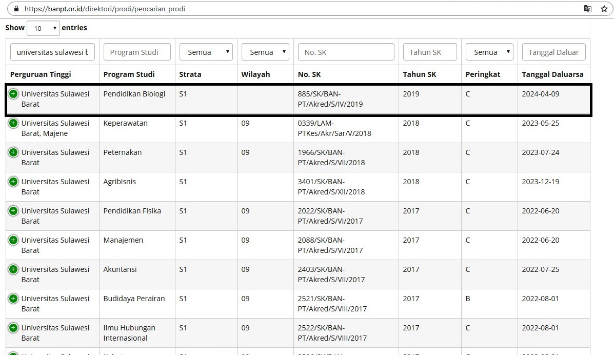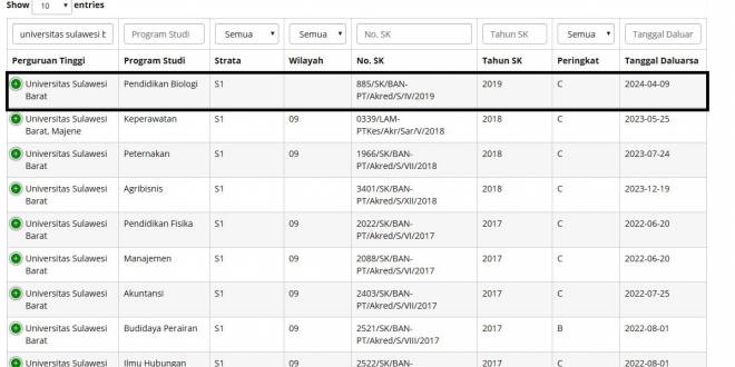 Dalam kolom pencarian dengan kata kunci Universitas Sulawesi Barat, maka seluruh Prodi di universitas ini akan dimunculkan. Termasuk Prodi Biologi.