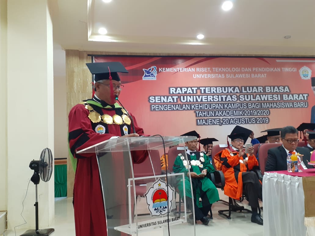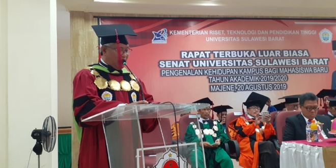 Foto: Rektor Unsulbar, Dr.Ir.H. Akhsan Djalauddin, Ms saat menyampaikan pidato sambutan pada PKKMB Unsulbar, Selasa, (20/08/2019).