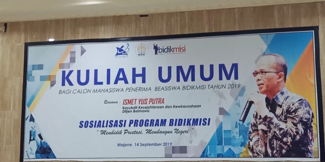 Karakterunsulbar.com- Direktoral Jenderal Pembelajaran dan Kemahasiswaan (Dirjen Belmawa), Kementerian Riset, Teknologi dan Pendidikan Tinggi (Kemenristekdikti) membawakan kuliah umum terkait Biaya Pendidikan Mahasiswa Miskin Berprestasi (Bidikmisi), Sabtu (14/09/2019).