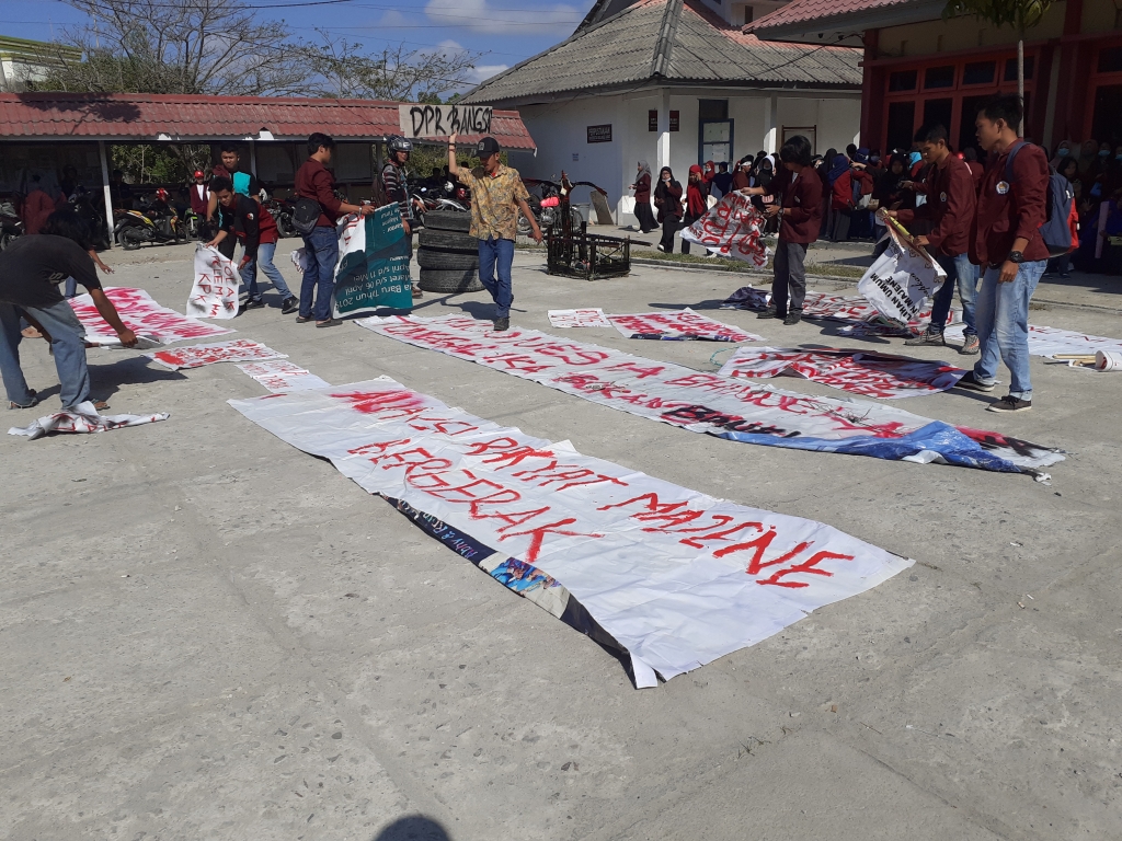 Beragam spanduk yang ditulisi oleh mahasiswa siap dibentangkan menuju halaman gedung Dewan Perwakilan Rakyat Daerah (DPRD) Majene.