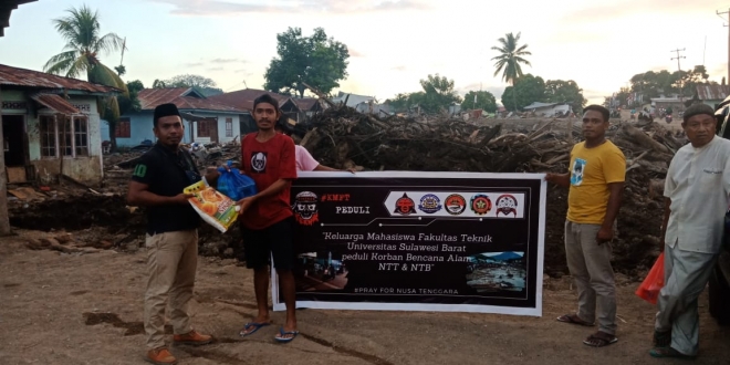 Karakterunsulbar.com- Keluarga Mahasiswa Fakultas Teknik (KMFT) Universitas Sulawesi Barat (Unsulbar) salurkan bantuan kemanusiaan kepada korban banjir dan angin puting beliung di Nusa Tenggara Barat (NTB) dan Nusa Tenggara Timur (NTT).