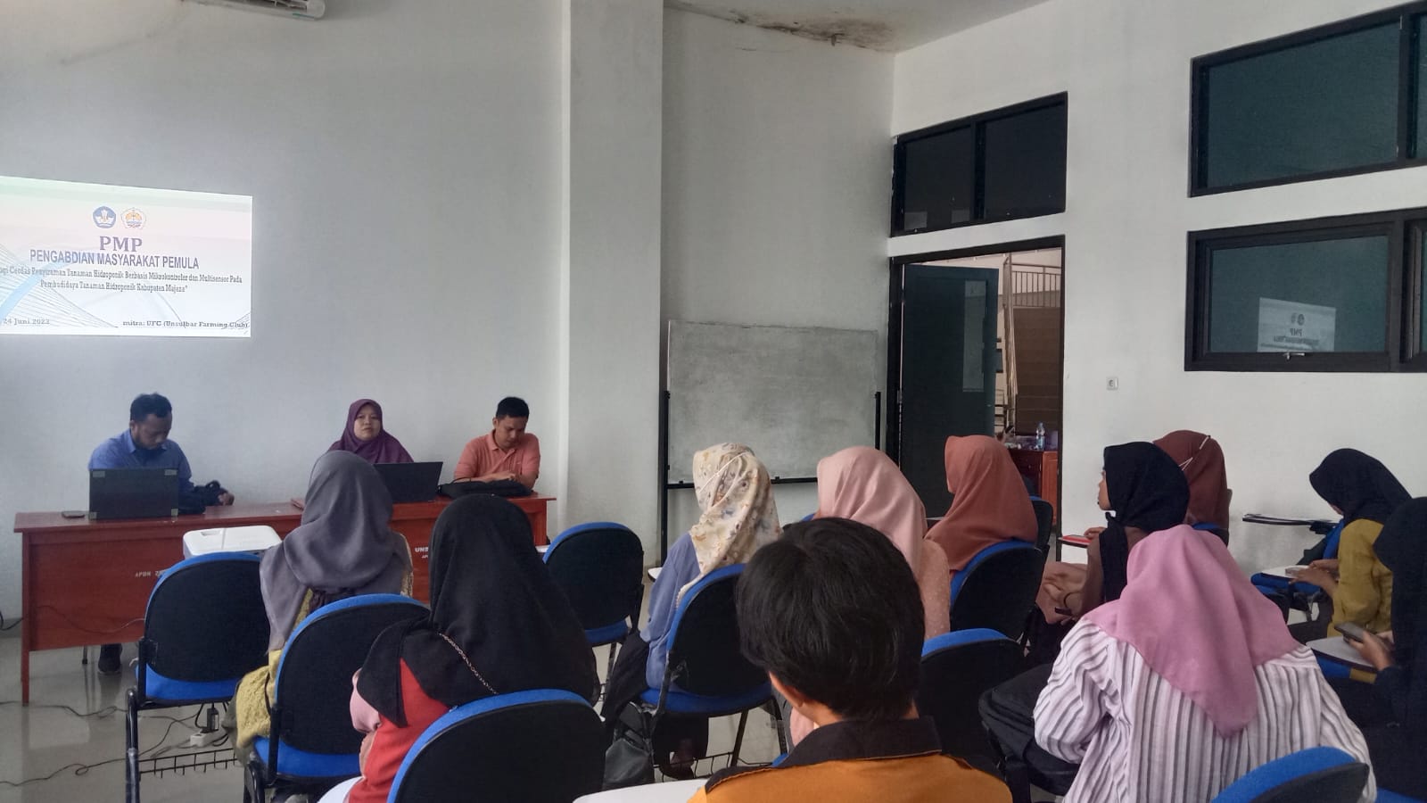 Ketua pelaksana kegiatan PMP, Ummu Kalsum, S.Pd., M.Si. menjelaskan bahwa kegiatan pengabdian tersebut bertujuan memberikan pemahaman awal kepada masyarakat tentang pemanfaatan sistem mikrokontroler dan multisensor dalam proses penyiraman pada tanaman hidroponik.