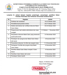 Pada lampiran III Surat Dinas nomor 001/UN55.8/PanselPD/X/2023 berisi jadwal tahapan kegiatan penjaringan, penyaringan, pemilihan dekan Fakultas Peternakan dan Perikanan Unsulbar, ditulis bahwa Penetapan Dekan terpilih diagendakan 14 November 2023.