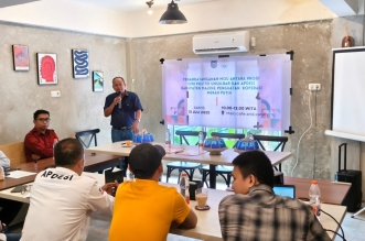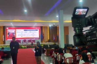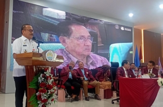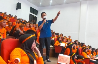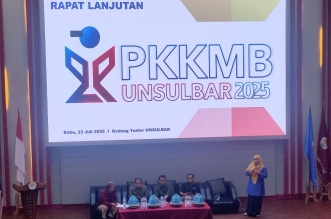 PKKMB FISIP Hukum Unsulbar di aula Thether Kampus Padha-Padhang, kelurahan Tande Timur, Majene, 15/8/2025, tampak di layar Wakil Kepala Badan Penyelenggara (BP) Haji Republik Indonesia, Dahnil Anzar Simanjuntak memberikan ...